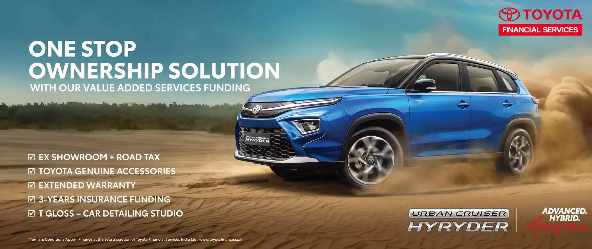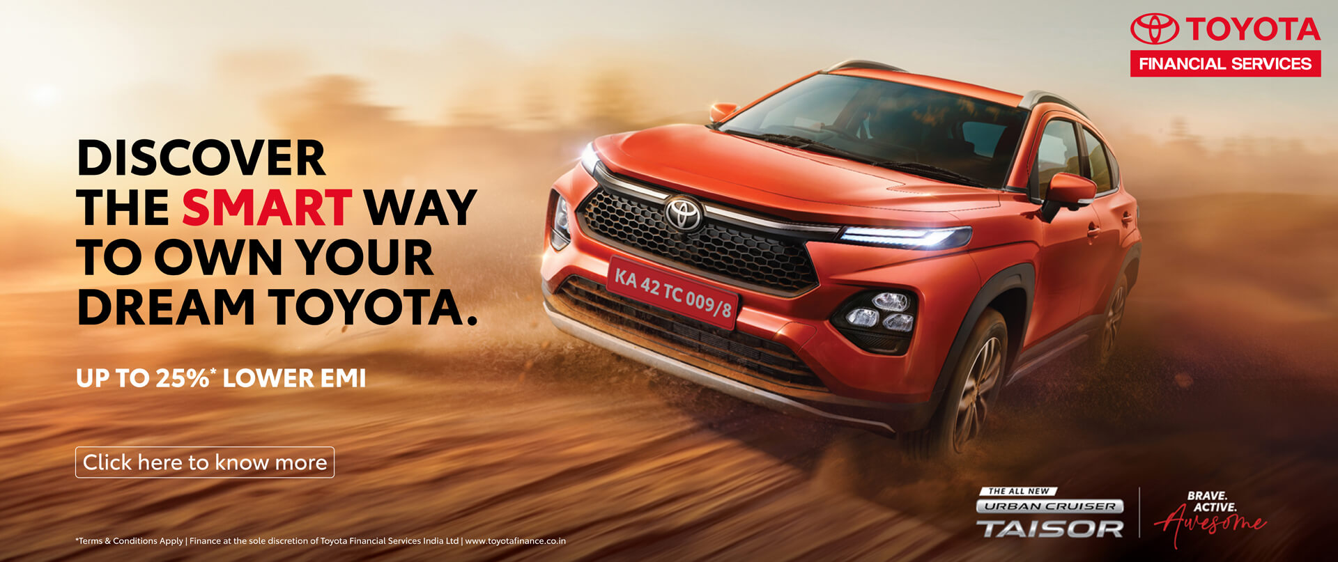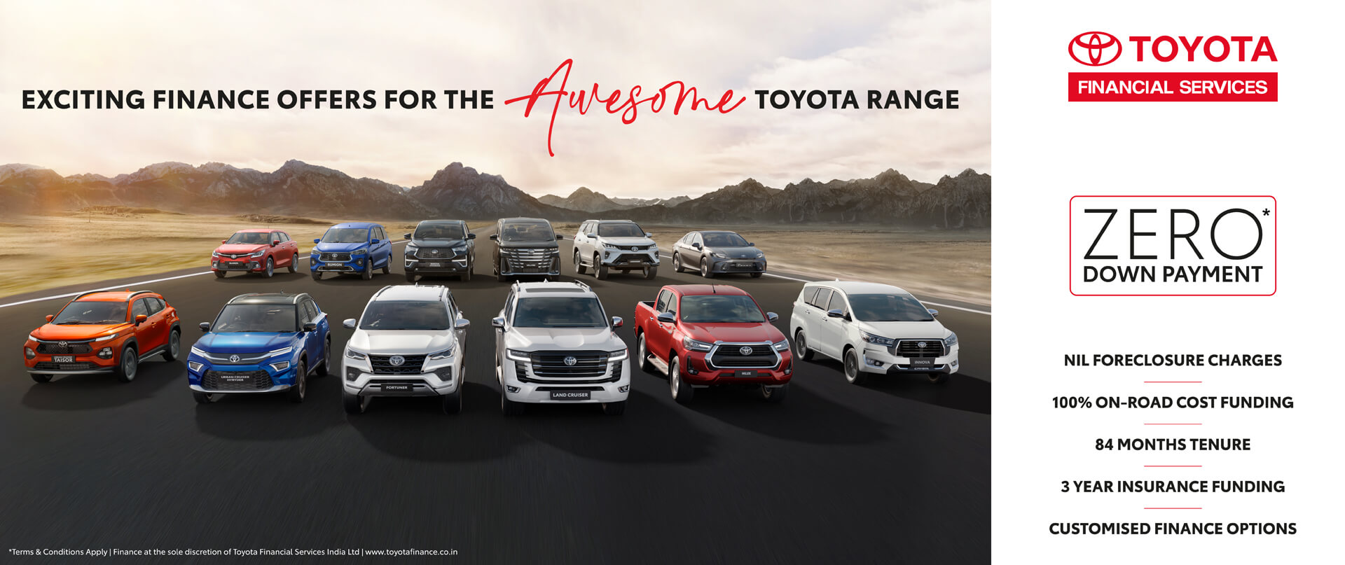 At Toyota Financial Services, We understand that your requirement is unique. We have designed a range of products from which you choose the one that suits your requirements best and drive home your dream Toyota car.