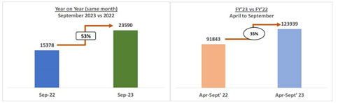 Bangalore, 01 st October 2023 : Toyota Kirloskar Motor registered yet another remarkable month of performance, selling 23,590 units in the month of September 2023. This represents a strong growth of (+) 53% over the same period last year where the company sold 15,378 units. Total sales achieved include domestic units of 22,168 and export of 1,422 units. In the previous month of August 2023, the company achieved its highest monthly wholesale figures ever by selling 22,910 units.