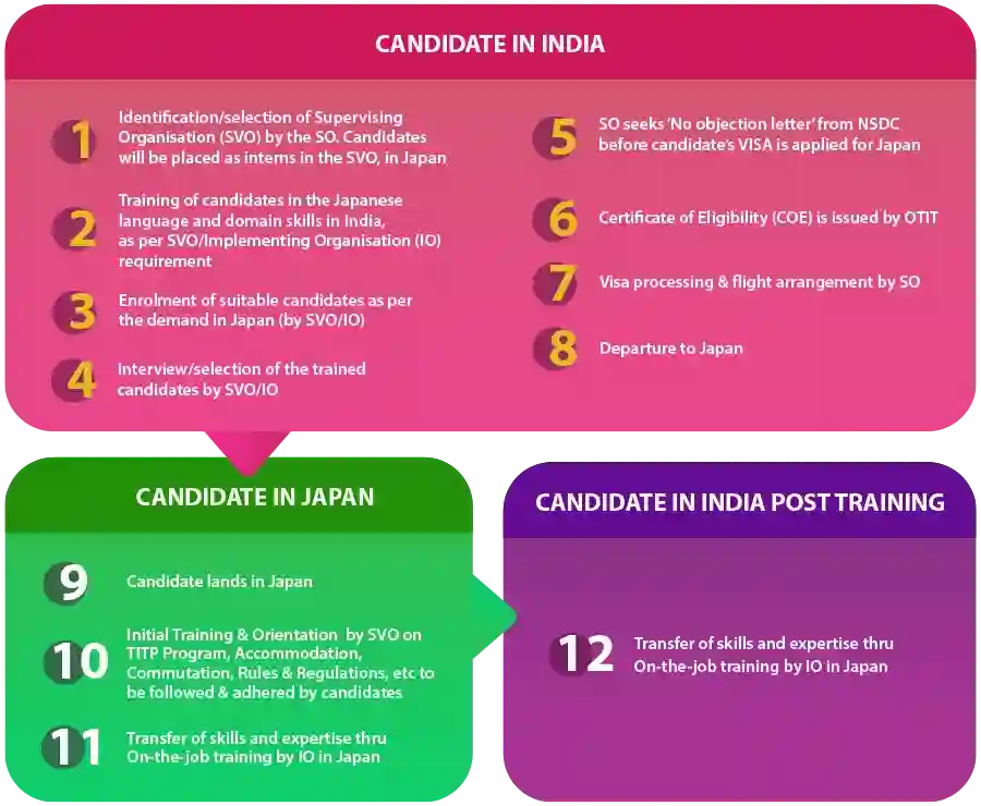 Hence, if a TITP candidate gets a job in any of the 14 fields, then he/she is eligible for residing in Japan while working. Candidates must ensure that all regulations of Japan are followed. The SO will also have to ensure that NSDC is informed of such cases through proper protocols and documentation.